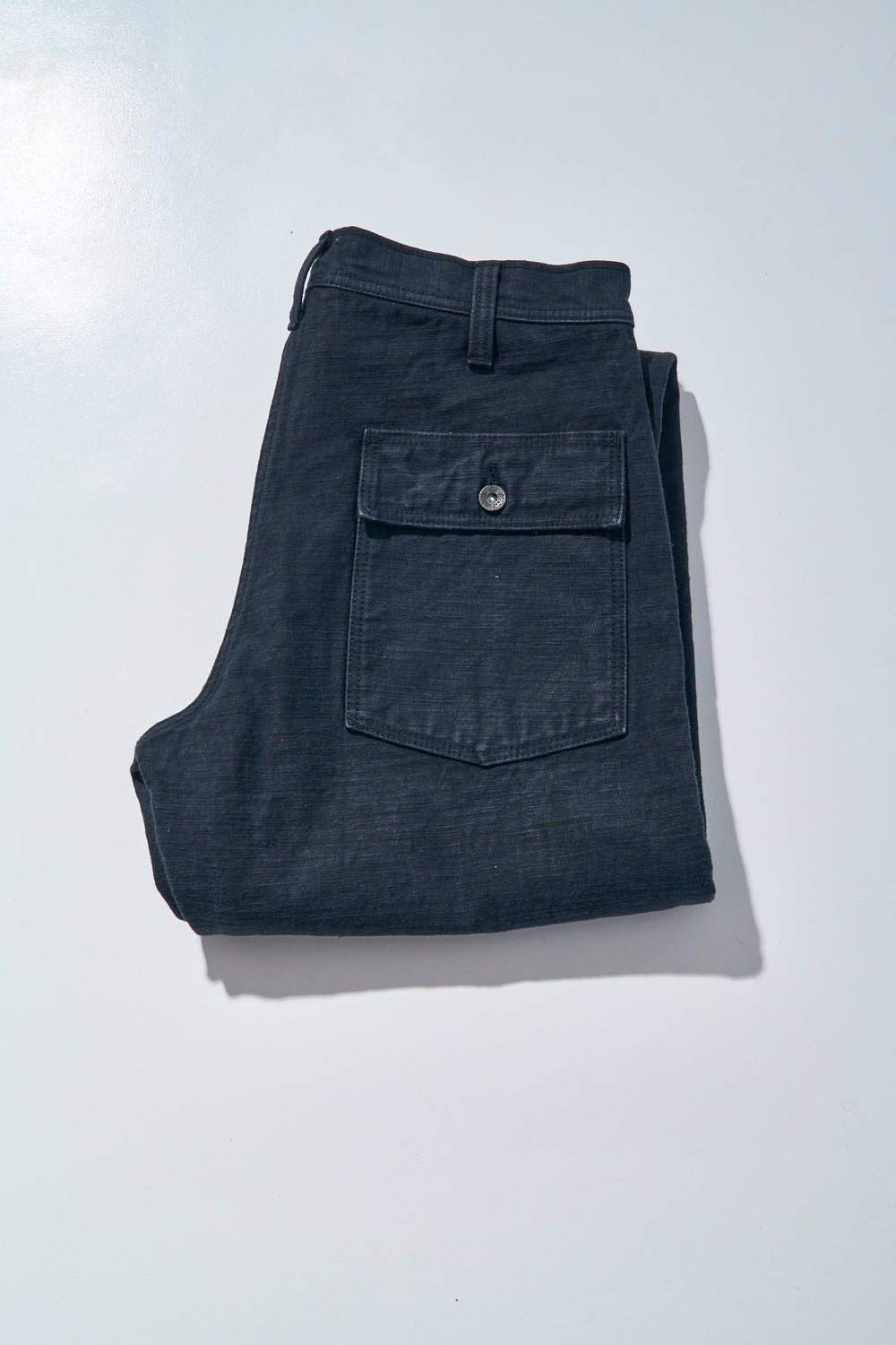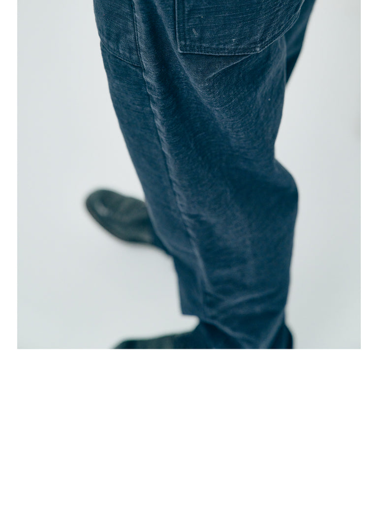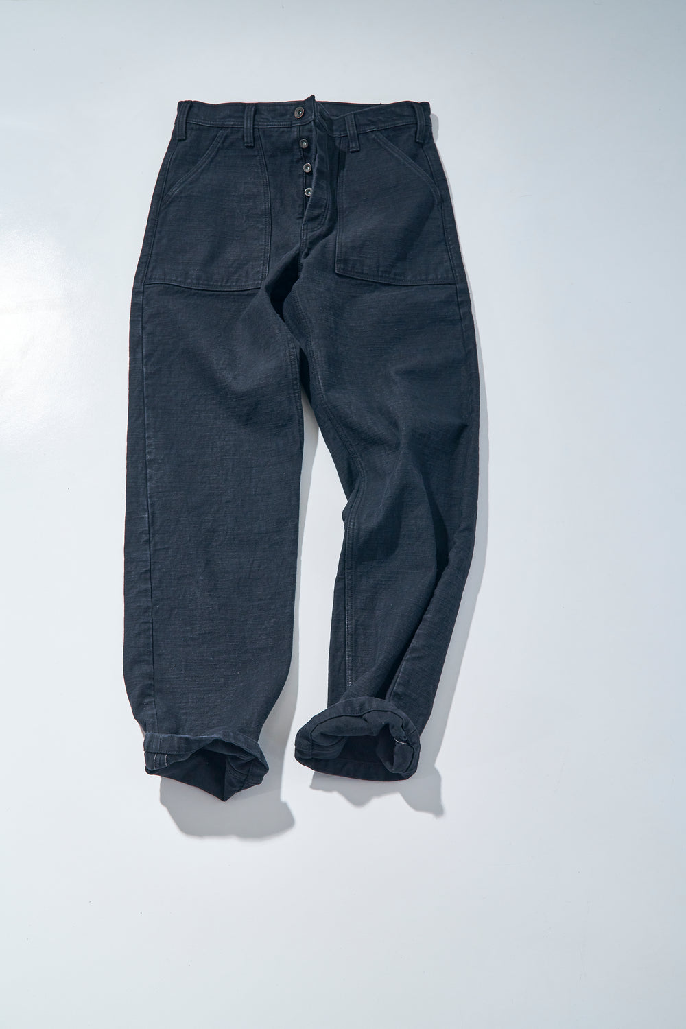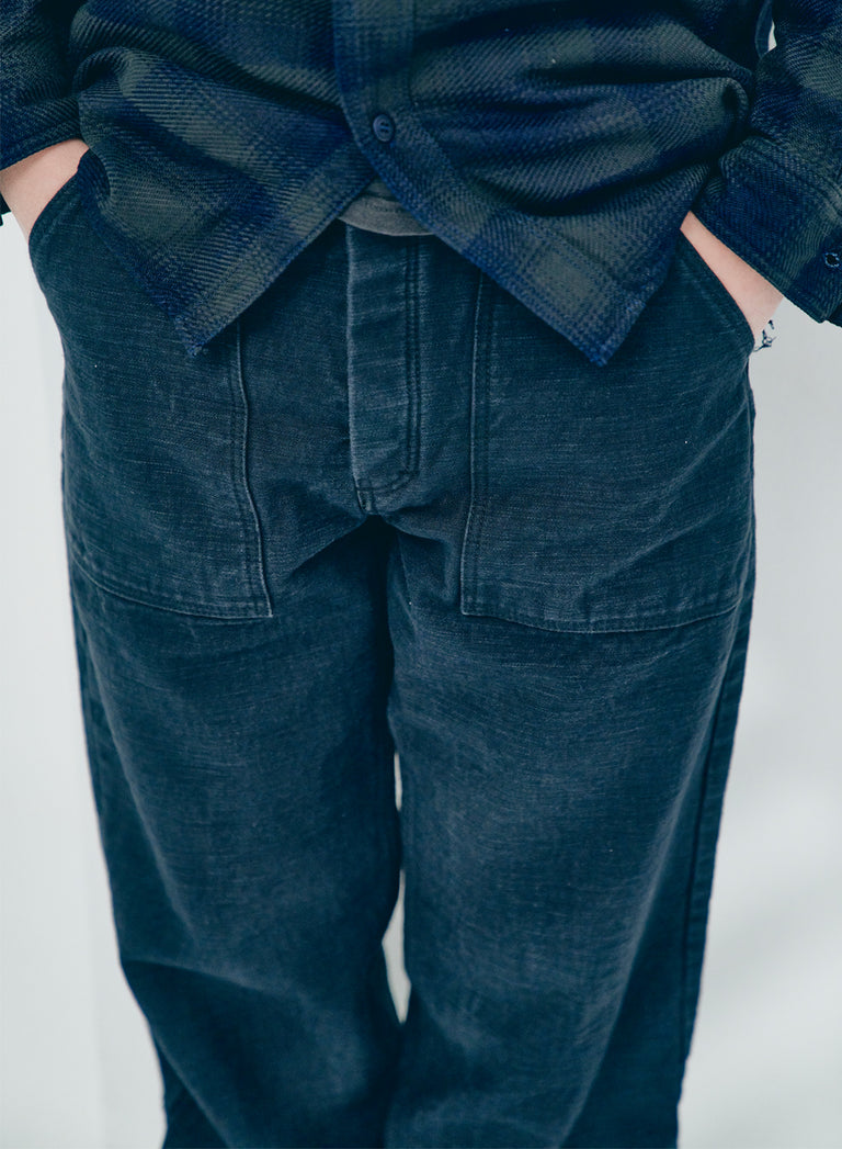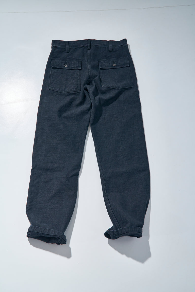 Pantalon Samurai Jeans SJ52BK en toile 15oz sulfur-dyed black. Baker pants japonais robustes avec poches plaquées, coupe droite et fading noir charbon évolutif. Construction 100 % japonaise.